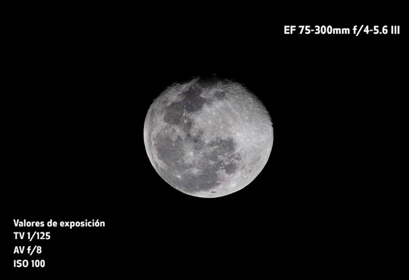 En lo que se refiere a la luna, al ser un cuerpo brillante, rodeado de espacio oscuro, es posible que el exposímetro de la cámara se confunda, por lo que sugerimos que se utilice la exposición manual con los siguientes valores: