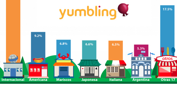 La comida es lo más importante para los Yumblers, pero ¿qué comen? 24.1% de la actividad en restaurantes está relacionado con comida mexicana, 24% con comida internacional, 9.2% con comida americana, 6.8% con mariscos, 6.6% con comida japonesa, 6.5% con comida italiana y 5.3% con comida argentina. El restante 17.5% se reparte entre otros estilos de cocina.