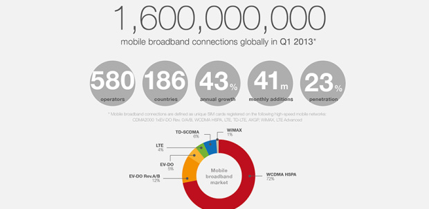 Anualmente se tiene un crecimiento del 43 por ciento, mensualmente se agregan 41 millones y la penetración a nivel mundial es del 23 por ciento. WCDMA HSPA tiene el 72 por ciento de las conexiones, seguido de EV-DO Rev A/B y TD-SCDMA.