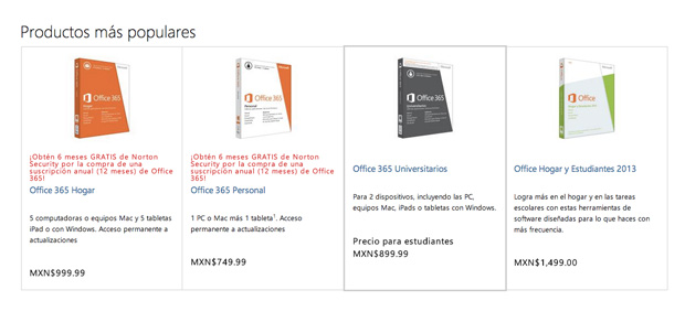 Dentro de Microsoft Store encuentras gran variedad de productos y promociones de acuerdo a la temporada. Entre esos productos están la paquetería Office en sus diferentes versiones (para universitarios, para Mac, en la nube, entre otros) desde sólo 74.99 pesos al mes. Además de Windows 8.1, Visio, Project y muchos más para toda la familia y sus necesidades.