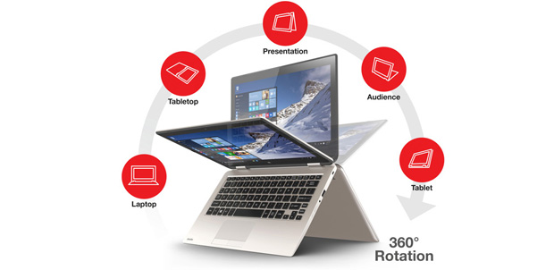 La Satellite Radius L15W cuenta con cinco modos de uso con los que podrás realizar tareas y presentaciones de una forma diferente, adaptándose a tus preferencias y dándole un giro de 360° a tu forma de trabajar ya sea en su modo laptop, presentación, audiencia, tabletop o tablet .