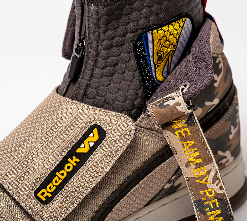 - El logo enmarcado tradicional de la Unión Jack de Reebok es sustituido por el logotipo “W” de Weyland Yutani (la compañía ficticia que aparece en el film) con una aplicación de caucho moldeado.