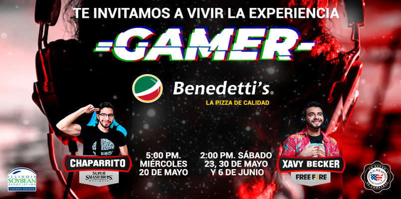 U.S. Meat Export Federation (USMEF) y Benedetti’s Pizza nos invitan a vivir una experiencia gamer con Chaparrito y Xavy Becker. Sesiones de Super Smash Bros Ultimate y Free Fire acompañadas de pizza.