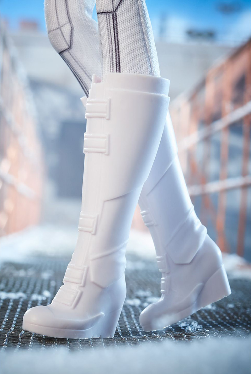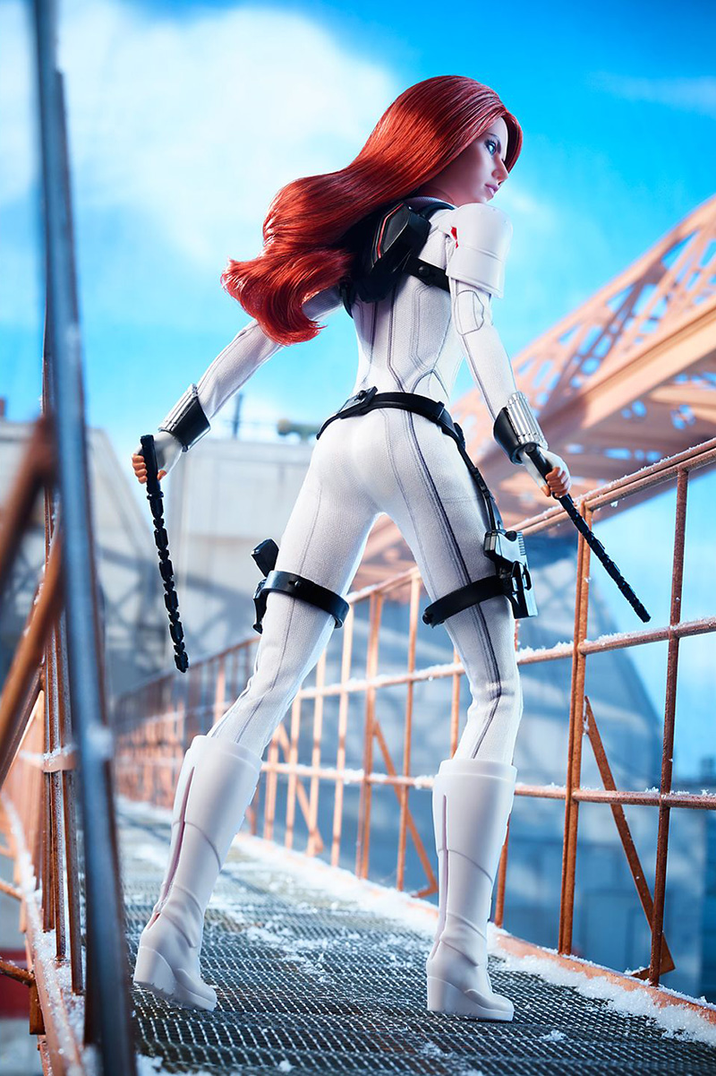 De igual forma, se presenta la muñeca Black Widow Barbie con el exclusivo traje completamente en blanco con hombreras blindadas, botas hasta la rodilla y un cinturón de para sus armas con el formidable icono rojo del reloj de arena de hebilla.