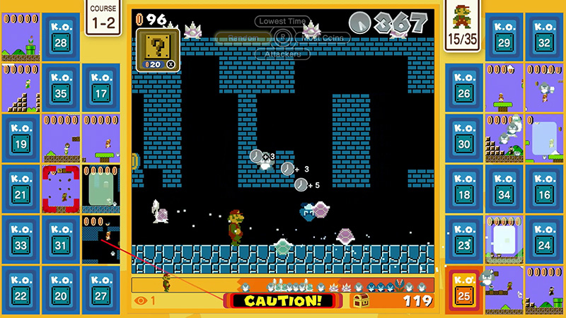 En Super Mario Bros. 35 a cada jugador se le asigna la misma etapa cronometrada, pero derrotar a los enemigos te dará más tiempo mientras atacas a tus oponentes. Cada enemigo eliminado será enviado a otros rivales.