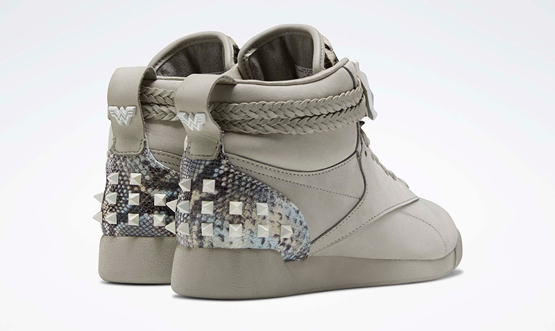Los Cheetah Freestyle Hi, imitan la chamarra de cuero de Bárbara, con detalles como una cubierta de nobuk, una lengüeta de pelo de caballo con estampado de guepardo y un detalle de piel de serpiente en el talón.