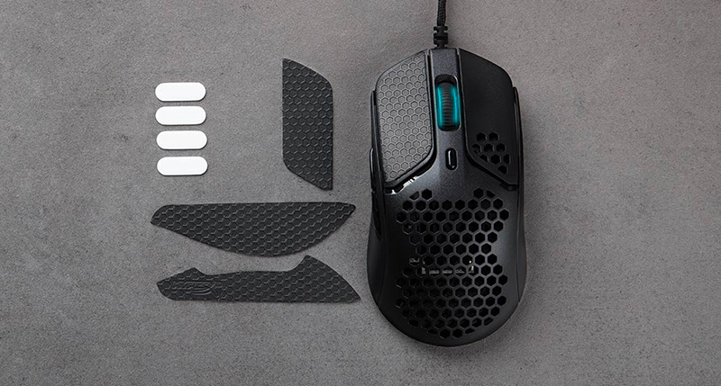 Incluye cinta de agarre para ambos lados, así como los botones izquierdo y derecho; además, cuenta con un juego de reemplazo de patines de PTFE.