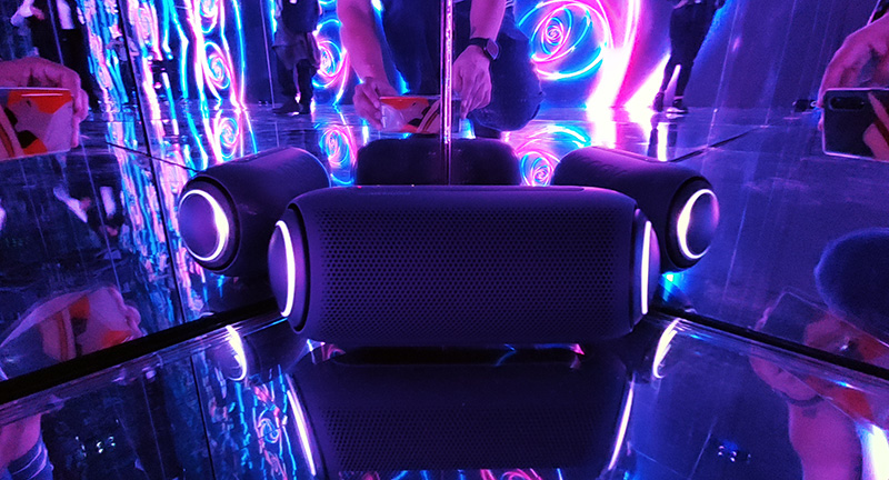 Con el objetivo de llevar la experiencia audiovisual, Dreams, a un nuevo nivel, LG integró 20 bocinas LG XBOOM Go PL7 distribuidas estratégicamente en las salas más icónicas de la exhibición: Iluminación, Caleidoscopio, Circo y Estrellas para demostrar su excepcional en sonido.