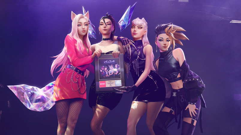 Ahri, Kai’Sa, Evelynn y Akali de League of Legends conforman el supergrupo de pop virtual K/DA y recentemente ha logrado un disco de oro con su exitosa canción POP/STARS.