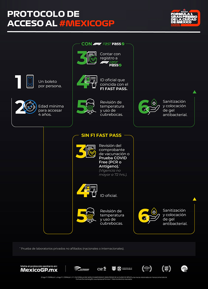 - Se implementará un sistema de línea rápida de acceso (F1 Fast Pass), para aquellos asistentes que realicen un registro previo al evento en sitio web de la carrera (a partir del 1 de octubre), en donde tendrán que subir su certificado de vacunación COVID-19 de esquema completo emitido por una entidad autorizada, ya sea nacional o internacional, o una prueba (PCR o de antígenos) con resultado negativo de uno de los laboratorios privados afiliados a la carrera para obtener un código de acceso certificado y agilizar la entrada al inmueble (La lista de laboratorios afiliados estará disponible a partir del 1 de octubre. Revisar Anexo B).