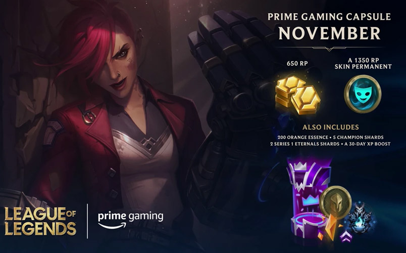League of Legends: Wild Rift: a partir del 18 de noviembre, los miembros de Prime podrán conseguir contenido exclusivo cada dos semanas por todo un año (24 recompensas en total) para el juego para dispositivos móviles. El contenido incluirá adornos, gestos, retiradas, aspectos y poses de aspecto aleatorios.