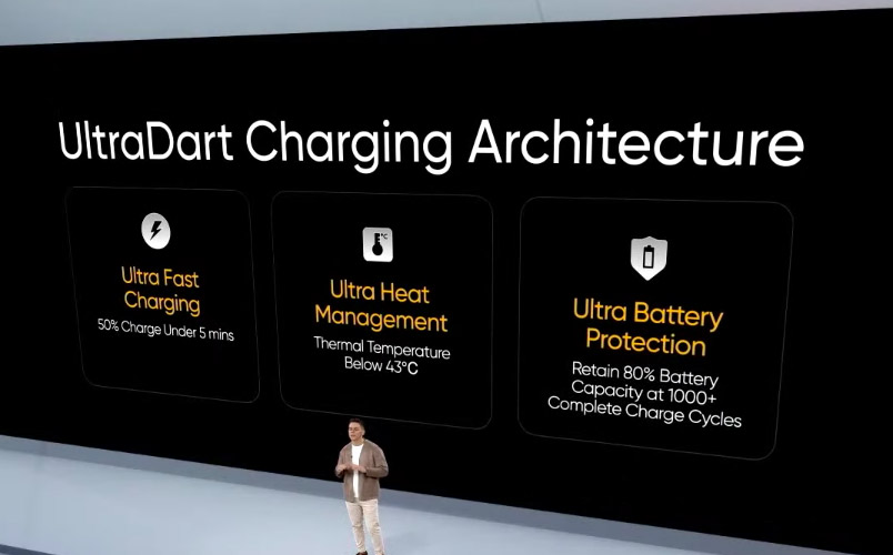 La arquitectura de carga UltraDart, también llamada simplemente UDCA, es el nuevo avance técnico de realme. También es la primera arquitectura de carga del mundo que puede admitir potencias de carga entre 100W y 200 W con tres avances tecnológicos que incluyen: velocidad, seguridad y duración de la batería.