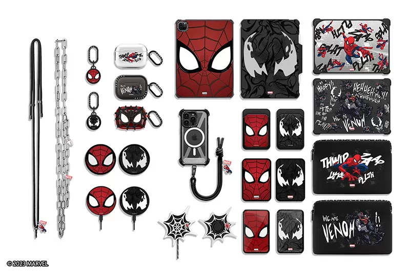 La colaboración de CASETiFY y Marvel abarca accesorios para AirPods, AirPods Pro, AirPods Max, AirTags, correas de Apple Watch, cargadores inalámbricos, tarjeteros MagSafe, fundas para baterías MagSafe, correas para teléfono, y más. Esta colección destaca una funda edición especial de Venom para AirPods Max, así como una funda de Spider-Man para AirPods con diseño de telaraña 3D.