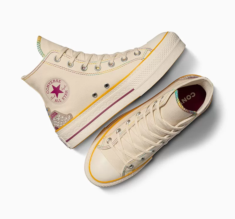 La plataforma Chuck Taylor All Star Lift elevará el estilo con costuras de colores en degradado sobre lona natural y distintos tonos para las líneas características de la media suela. En la parte trasera del calzado encontrarás una calavera emplumada bordada y dentro de la placa una flor de cempasúchil.