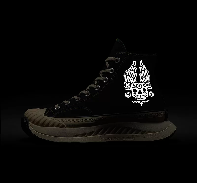 Por último, el Chuck 70 AT-CX muestra un gráfico reflectante de calavera emplumada y el parche con el mismo efecto, costuras de colores y su característica suela de tracción en contraste de negro y naranja, así como su puntera de TPU para mayor durabilidad; estas dos últimas siluetas cuentan con un forro estampado de flores y calaveras.