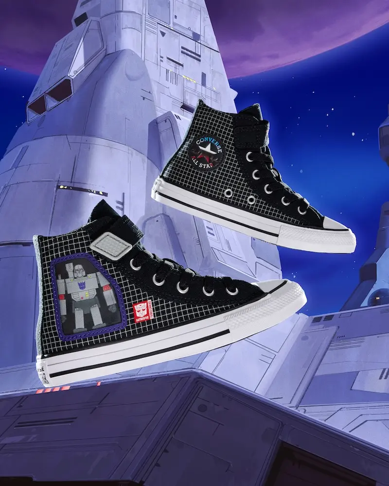 Consta de dos Chuck Taylor All Star Autobot y Decepticon con sus parches personalizados y un colgante de goma moldeada inspiradas tanto en Energon Mace y Energon Axe, más dos Chuck Taylor All Star para los más pequeños de Bumblebee, Optimus Prime y Megatron.
