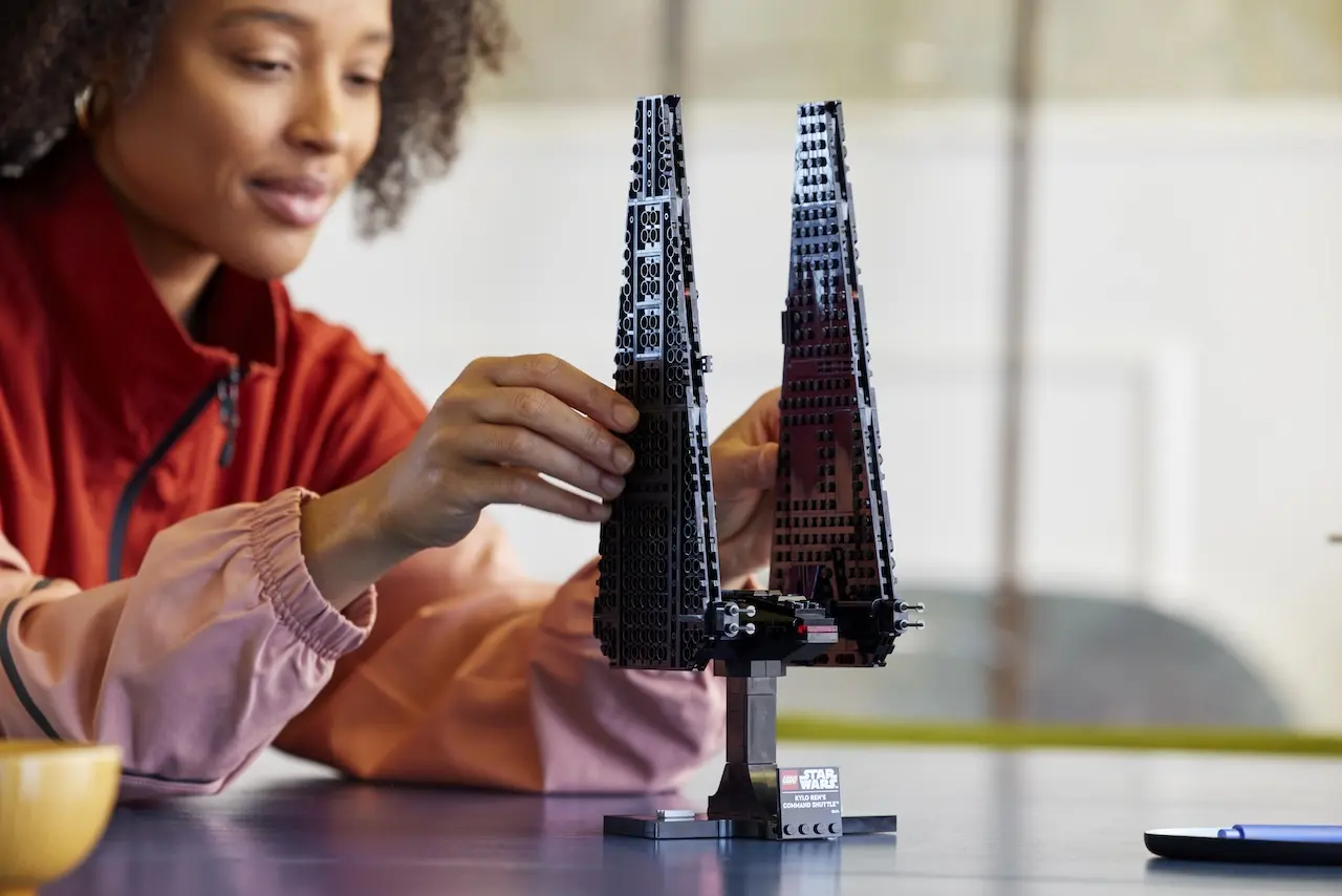 Justo a tiempo para el 10º aniversario de Star Wars: El Despertar de la Fuerza, el set de construcción LEGO Star Wars Kylo Ren’s Command Shuttle es la nueva incorporación a la Colección de Naves Estelares. El set incluye un elegante soporte con una placa de identificación e información sobre la nave, por lo que es perfecto para exponerlo.